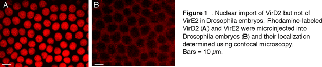 III. Determination of the relative contributions of VirD2 and VirE2 NLSs to T-complex nuclear transport. We can generate "artificial T-complexes" by cleaving fluorescently-labeled single-stranded DNA molecules containing a T-DNA border with VirD2 protein in vitro. These DNA/VirD2 complexes can be coated with VirE2 protein in vitro. By microinjecting fluorescently-labeled T-complexes containing wild-type or mutant VirD2 NLSs into plant cells, we are currently measuring the relative contributions of the VirD2 and the VirE2 NLSs to the rate and extent of T-complex nuclear import.