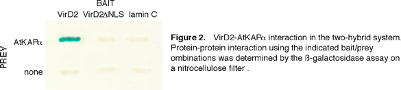 C. Identification of AtKAP(alpha), an Arabidopsis protein that recognizes the VirD2 NLS. We began our study of plant factors that interact with the invading T-complex with identification of an Arabidopsis protein that binds the VirD2 NLS. Using a yeast two-hybrid screen (28) with VirD2 as bait, we identified an Arabidopsis cDNA clone, designated AtKAP(alpha) (Arabidopsis thaliana karyopherin(alpha), after eliminating the false positives using a non-specific lamin C bait (5) and a VirD2 mutant lacking the NLS (VirD2(delta)NLS, Figure 2). We isolated the full length cDNA of AtKAP(alpha) and confirmed its specific interaction with VirD2 by coimmunoprecipitation (4).