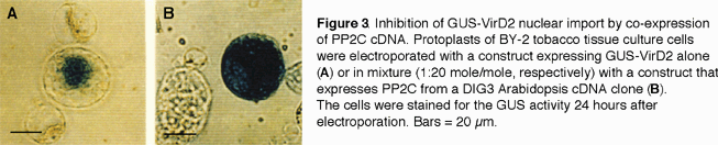 When we electroporated a GUS-VirD2 NLS fusion gene into tobacco BY-2 protoplasts, GUS activity localized exclusively to the nucleus in approximately 80% of the cells (Figure 3A). Co-electroporation of the PP2C gene sharply reduced GUS nuclear localization (Figure 3B), indicating that PP2C indeed negatively regulates nuclear trafficking of VirD2. We identified a consensus protein kinase C phosphorylation site on a serine residue (Ser-424) two amino acids upstream of the VirD2 NLS. We detected phosphorylation of Ser-424 both in vitro following incubation with protein kinase C and in vivo in tobacco protoplasts. Alteration of Ser-424 to alanine resulted in decreased nuclear import of a GUS-VirD2 mutant NLS fusion protein in tobacco protoplasts, and decreased tumorigenesis of an Agrobacterium strain containing this mutant VirD2 protein. We thus propose that phosphorylation of the serine residue near the VirD2 NLS potentiates T-complex nuclear import, and that the activity of a plant PP2C decreases VirD2 nuclear import and, hence, transformation by Agrobacterium (Tao and Gelvin, in preparation).