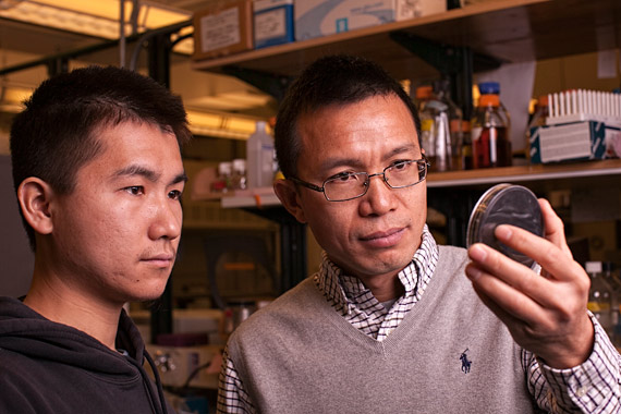 Purdue associate professor of biological sciences Zhao-Qing Luo, at right, and graduate student Yunhao Tan look at the growth of Legionella pneumophila bacteria in a petri dish. (Purdue University photo provided by Laurie Iten and Rodney McPhail)