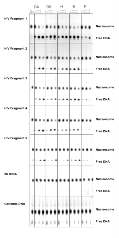 The HIV genome is rich in A and this nucleotide bias controls HIV phenotype by determining the highly unusual composition of all major HIV proteins. The bias is also responsible for the high frequency of narrow DNA minor groove sites in the double-stranded HIV genome. Since drugs that bind in the DNA minor groove disrupt nucleosomes on sequences that contain closely spaced oligo-A tracts which are prevalent in HIV DNA because of its bias, it was of interest to determine if these drugs exert this selective inhibitory effect on HIV chromatin. To test this possibility, nucleosomes were reconstituted onto five double-stranded DNA fragments from the HIV-1 pol gene in the presence and in the absence of several minor groove binding drugs (MGBDs). The results demonstrated that the MGBDs inhibited the assembly of nucleosomes onto all of the HIV-1 segments in vitro and in yeast cells in a manner that was proportional to the A-bias, but had no detectable effect on the formation of nucleosomes on control cloned fragments or genomic DNA. These results show that the MGBDs preferentially disrupt HIV-1 chromatin in vitro and in vivo and raise the possibility that these drugs in conjunction with sequence specific DNA cleaving agents might serve as a novel class of anti-HIV agents.